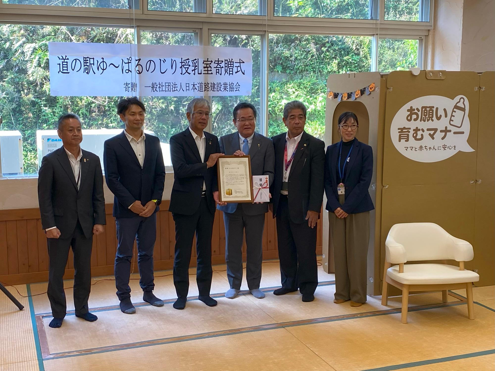 一般社団法人日本道路建設業協会九州支部から段ボール授乳室を道の駅ゆ~ぱるのじりに寄贈いただきました。国は道の駅の地域センター化を推進しており、今回の寄贈はこれに大きく貢献するもの。また災害時には子育て世代の不安や負担軽減にもつながることが期待されます。