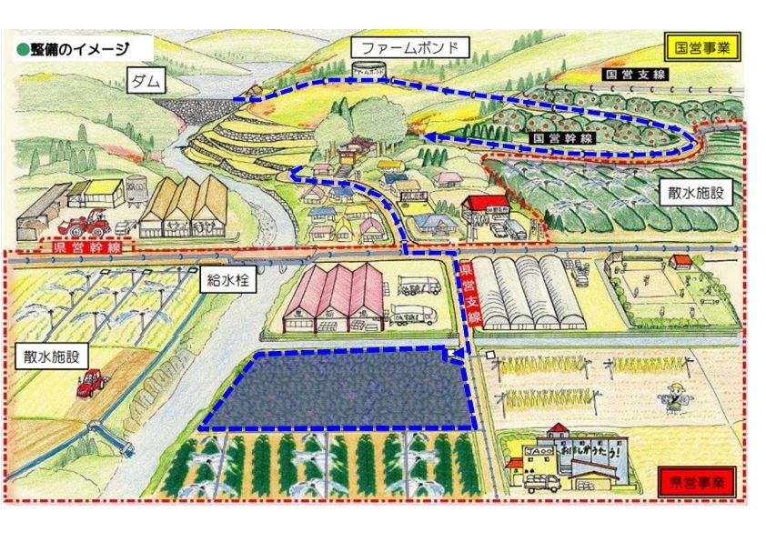 - 県営事業とは国営の幹線水路から地域へ配水するための幹線水路や農地へ配水するための支線水路、農地の区画整理や給水栓の設置等の工事となります。現在継続中です。