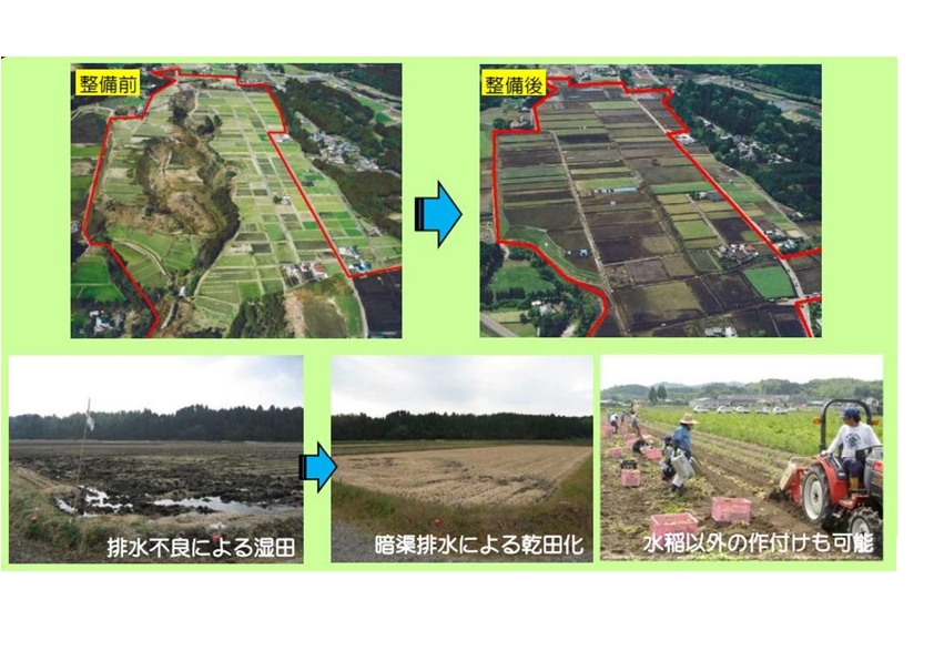 畑地かんがい事業の実施に併せて、不整形な農地の区画整理、用水路や排水路、農道、暗渠排水などを総合的に整備し、大型機械の導入や水田の汎用化を可能にし農業の生産性を向上させます
