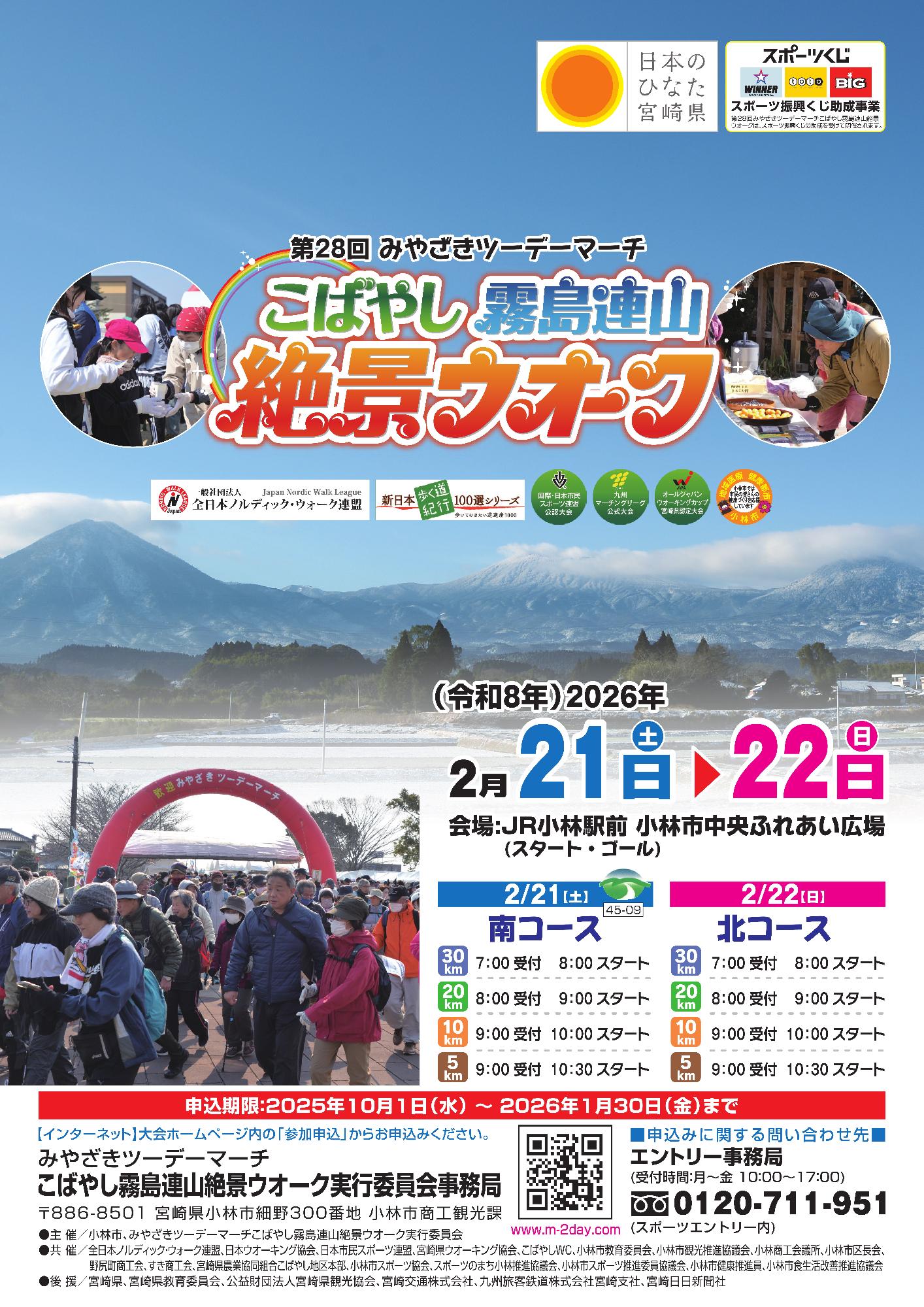 令和8年2月21日(土曜)、22日(日曜)に第28回みやざきツーデーマーチこばやし霧島連山絶景ウオークを小林市で開催します。
