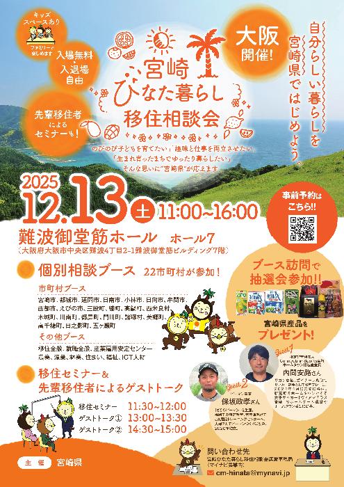 当日は、移住セミナーをはじめ、先輩移住者2名によるゲストトークも行われる他、宮崎県産品が当たる大抽選会も開催されます。