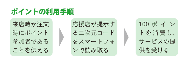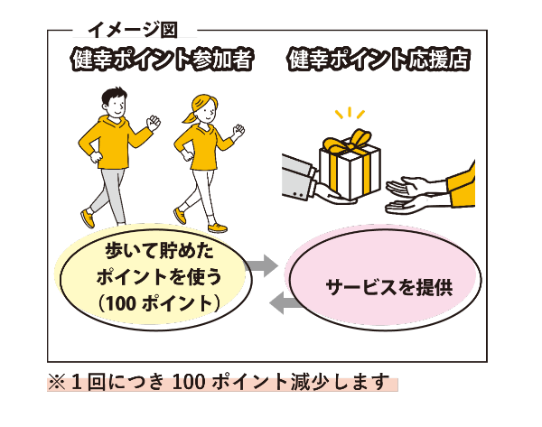 令和7年10月から令和8年1月の期間中、アプリ参加者に限り、貯まったポイント(100ポイント)を使って、健幸ポイント応援店によるサービスを受けることができます。