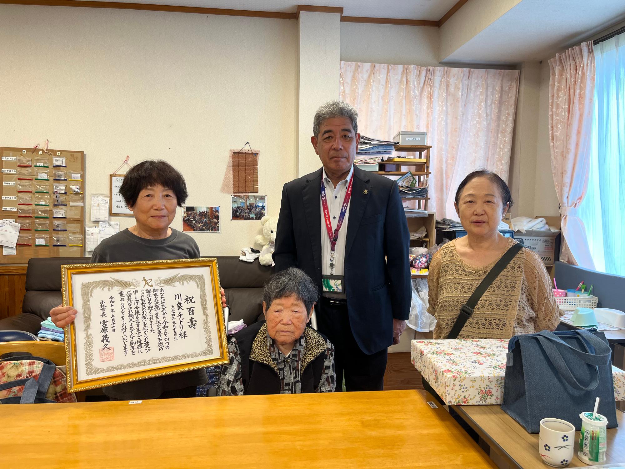 敬老の日を前に、市内で最高齢者である安藤フツノさんを訪問しました。安藤さんは大正7年生まれの107歳。賞状と花を贈呈し、長寿を祝いました。